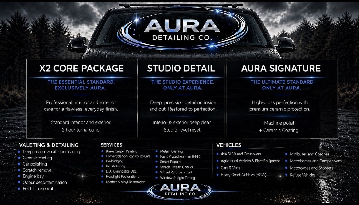 At Aura Detailing Co., we elevate your vehicle’s look through expert care, delivering immaculate finishes and pristine detailing that exudes luxury and sophistication. Cornwall